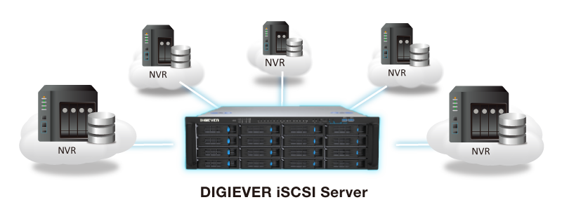 DIGIEVER iSCSI Server is an ideal video storage expansion solution for DIGIEVER NVR, especially for large-scale surveillance projects and long-term storage needs. One iSCSI Server can be assigned for multiple DIGIEVER NVRs (up to 5 NVRs) for video storage expansion.