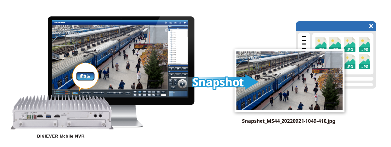 Instant playback allows users to quickly check what happened earlier while simultaneously viewing live videos on liveview page (Up to 15 minutes earlier). Users can simultaneously check previous videos and monitor live-view, by moving the window to desired position. After finding the key moment of event, users can take a snapshot or export a 5 minutes video to external USB device.