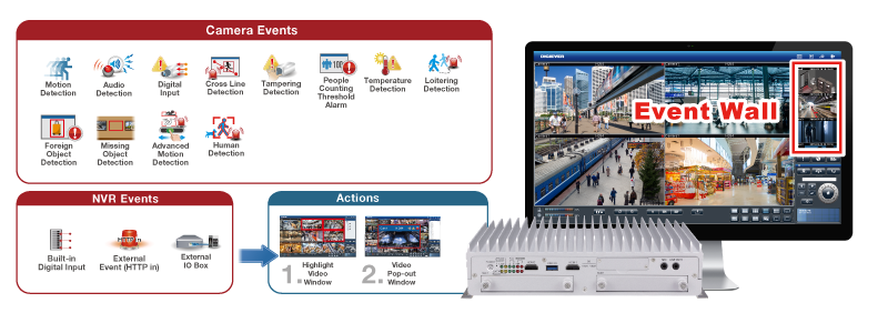 Users can instantly notice camera disconnection and the configured events. When an event is triggered, event log icon will start blinking in red exclamation mark. Clicking the event log icon, users can check the event list and playback the video clip.