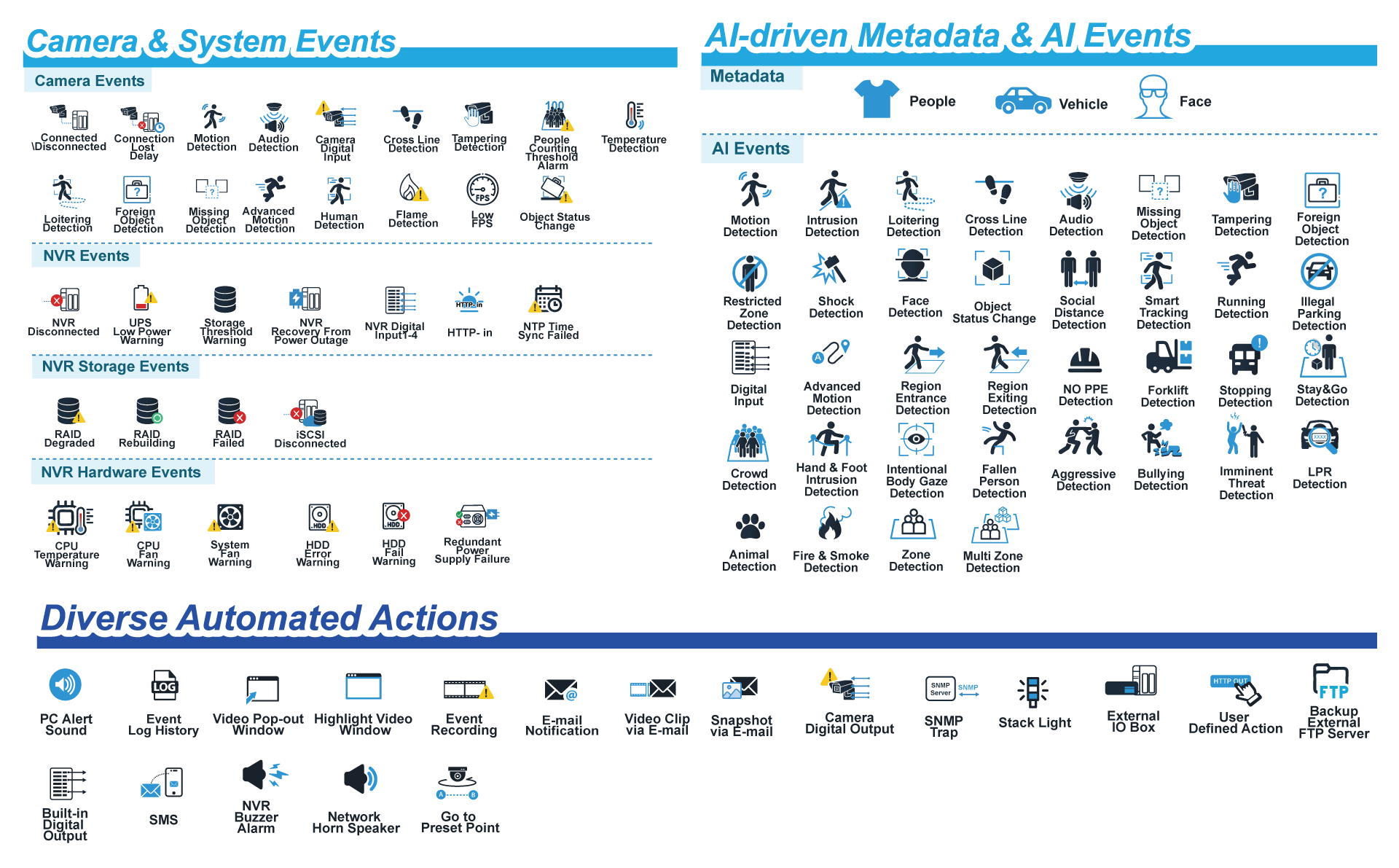 DIGIEVER VMS-NVR servers feature a comprehensive and future-proof AI Event & Action Management framework that unifies camera events, system events, storage events, metadata events, and AI-driven analytics within a single intelligent platform. Operators receive real-time notifications when events occur, ensuring timely response and efficient incident handling.
