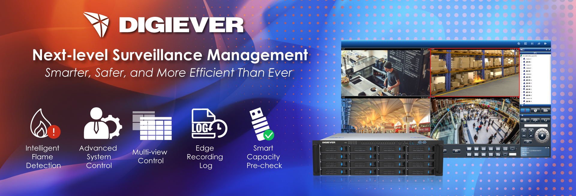 DIGIEVER continues to lead the industry with a comprehensive suite of IP video monitoring and management solutionspowered by its Linux-embedded VMS-NVR server featuring seven core professional capabilities. This robust foundation enables diverse vertical markets from government to retail to deploy secure, scalable, and high-performance surveillance infrastructures.