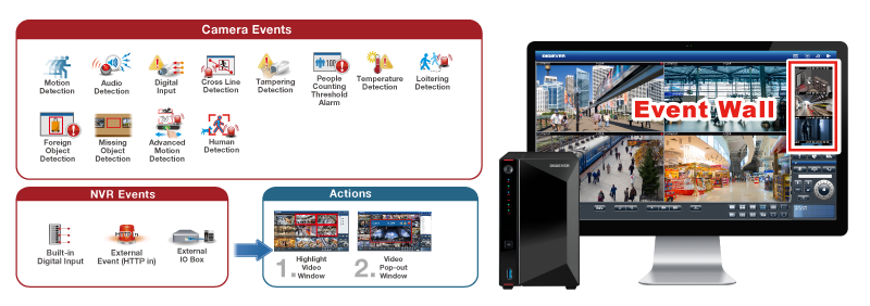 With intuitive Quick Configuration, users can finish trouble-free installation in only five steps on local display or remote browsers. The Linux-embedded NVR supports event/schedule recording, automatic recovery, threshold of recorded videos and video clip. Through event and action management, DIGIEVER NVR lets user set various events and actions for instant alert. For emergent need of video duplication, DIGIEVER NVR is equipped with diverse backup methods so that users can freely backup recorded videos to USB storage devices, NAS etc. In terms of security control, user privilege management and log system offer user detailed information for security control. All these essential features can be configured quickly on DIGIEVER NVR local display and remote browser interface.