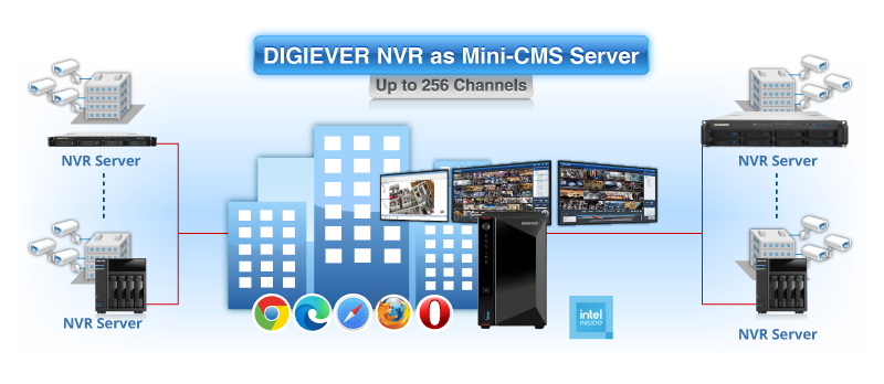 DIGIEVER NVR can be a mini-CMS server to connect other DIGIEVER NVR with the maximum of 256 channels for monitoring. User can simultaneously monitor other remote NVR sites without installing any extra VMS software.