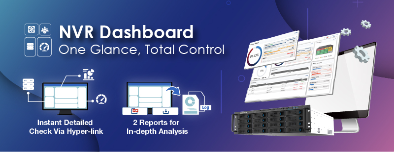 Users can instantly notice camera disconnection and the configured events. When an event is triggered, event log icon will start blinking in red exclamation mark. Clicking the event log icon, users can check the event list and play the video clip back. Also, users can quickly one-click to stop all buzzers and export event log without missing any alerts when the next event occurs.