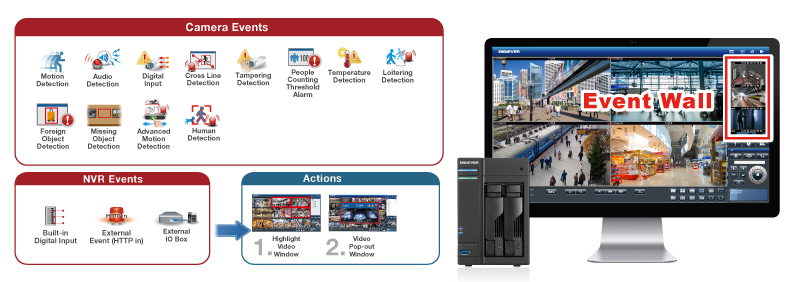 Users can instantly notice camera disconnection and the configured events. When an event is triggered, event log icon will start blinking in red exclamation mark. Clicking the event log icon, users can check the event list and play the video clip back. Also, users can quickly one-click to stop all buzzers and export event log without missing any alerts when the next event occurs.