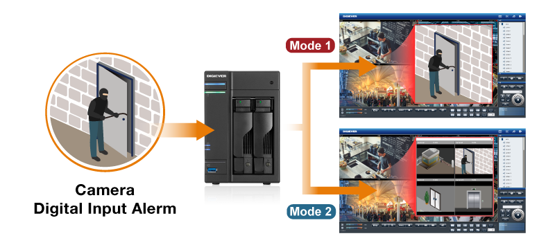 Via dual HDMI video output, DIGIEVER NVR supports 4 display modes for liveview monitoring allowing users to build the monitor room with high flexibility to satisfy diverse surveillance environments. Without installing extra PC, users can choose Dual display, Mirror display, Target display or eMap display to guard your place.