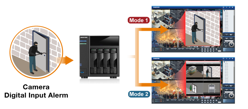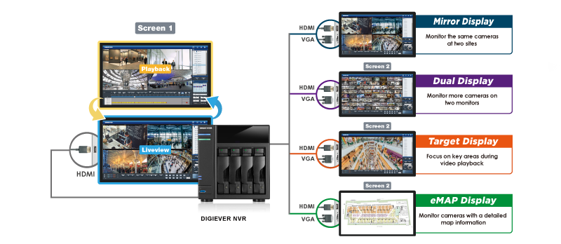 Via dual HDMI video output, DIGIEVER NVR supports 4 display modes for liveview monitoring allowing users to build the monitor room with high flexibility to satisfy diverse surveillance environments. Without installing extra PC, users can choose Dual display, Mirror display, Target display or eMap display to guard your place.