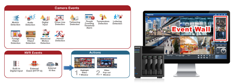 Users can instantly notice camera disconnection and the configured events. When an event is triggered, event log icon will start blinking in red exclamation mark. Clicking the event log icon, users can check the event list and play the video clip back. Also, users can quickly one-click to stop all buzzers and export event log without missing any alerts when the next event occurs.