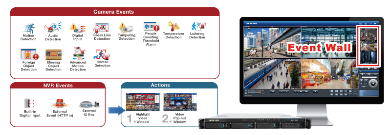 With intuitive Quick Configuration, users can finish trouble-free installation in only five steps on local display or remote browsers. The Linux-embedded NVR supports event/schedule recording, automatic recovery, threshold of recorded videos and video clip. Through event and action management, DIGIEVER NVR lets user set various events and actions for instant alert. For emergent need of video duplication, DIGIEVER NVR is equipped with diverse backup methods so that users can freely backup recorded videos to USB storage devices, NAS etc. In terms of security control, user privilege management and log system offer user detailed information for security control. All these essential features can be configured quickly on DIGIEVER NVR local display and remote browser interface.